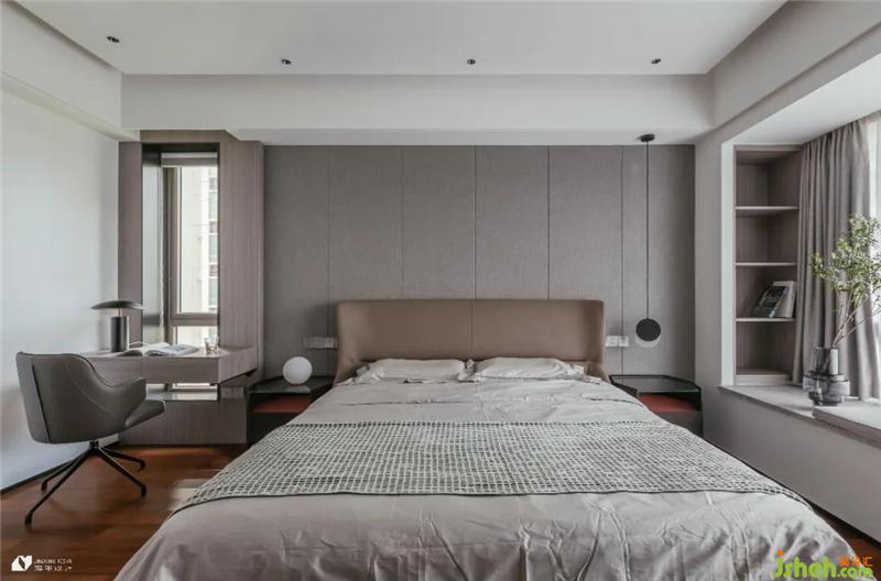主卧以简约的家具和静谧温馨的色调做主导,莫兰迪色床具呼应灰调背景墙,床头小窗处裹上一层原木,进而延伸出一方书桌,“生长”于墙面的书桌让空间有了更为统一的视觉观感。