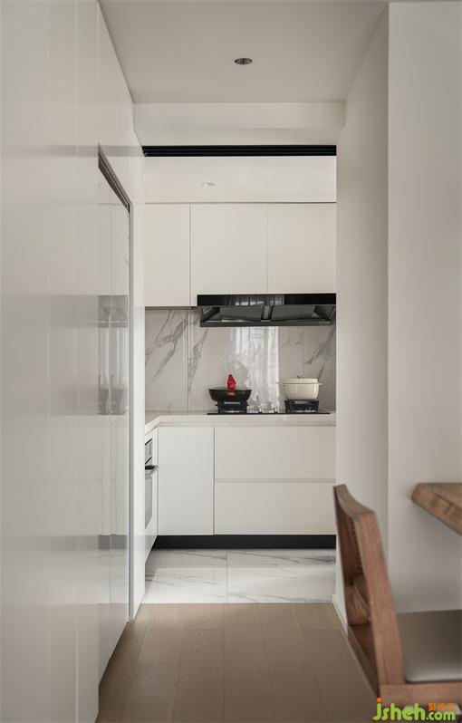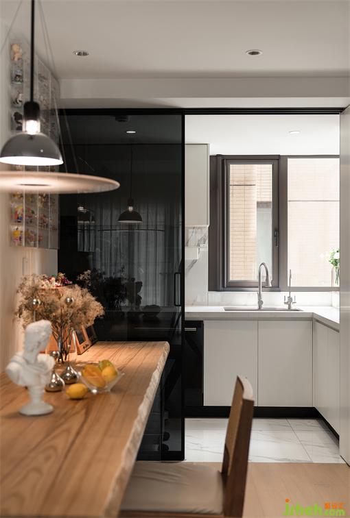 深圳住宅设计打通厨房餐厅空间,餐桌定制造型与承重墙结合