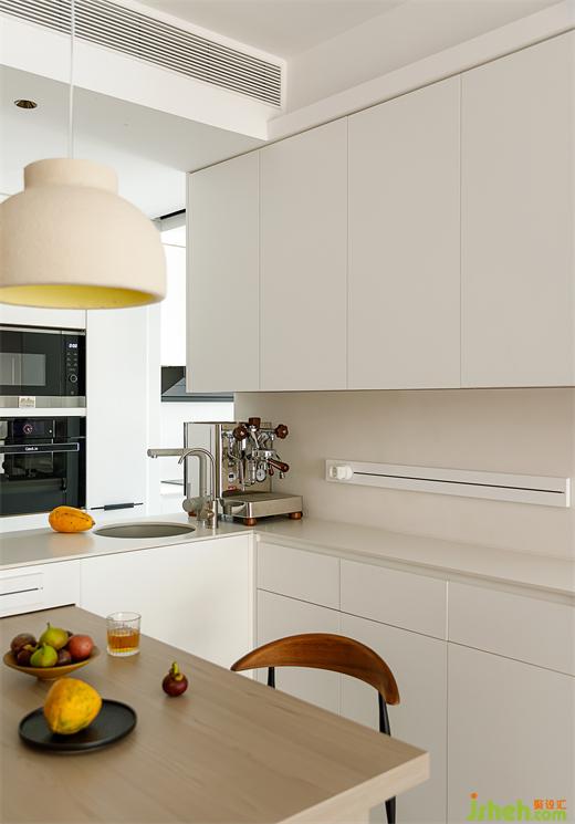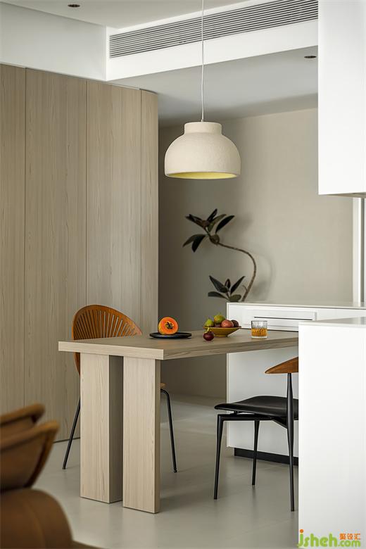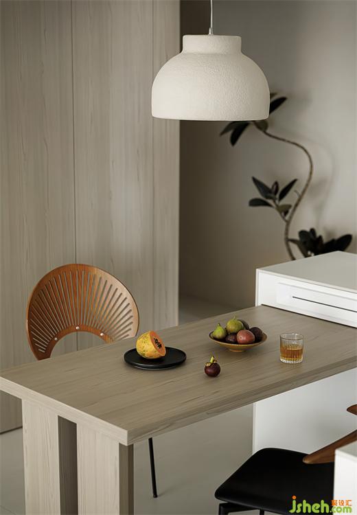 境相设计在餐厅增设水吧台,添加西厨功能;餐桌搭进岛台可拉可伸,家中来客人时也能够容纳多人使用。