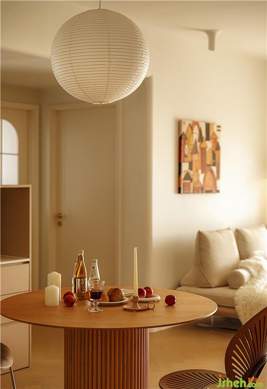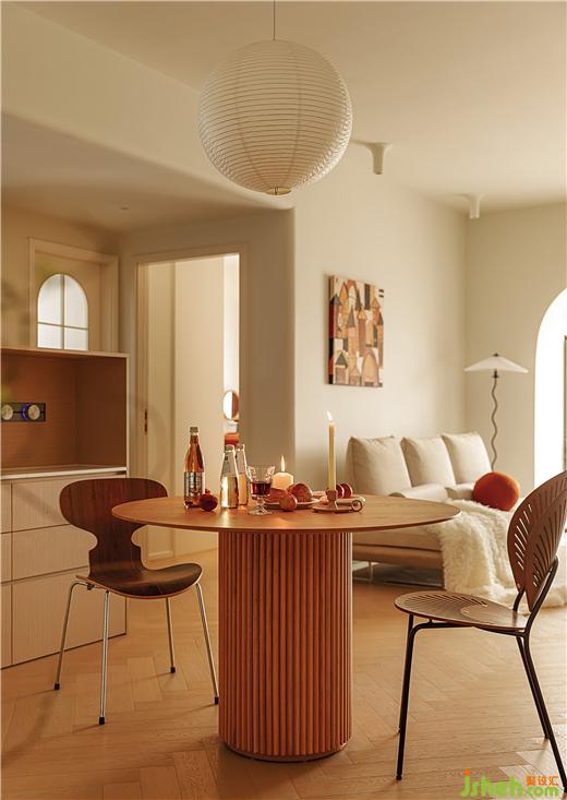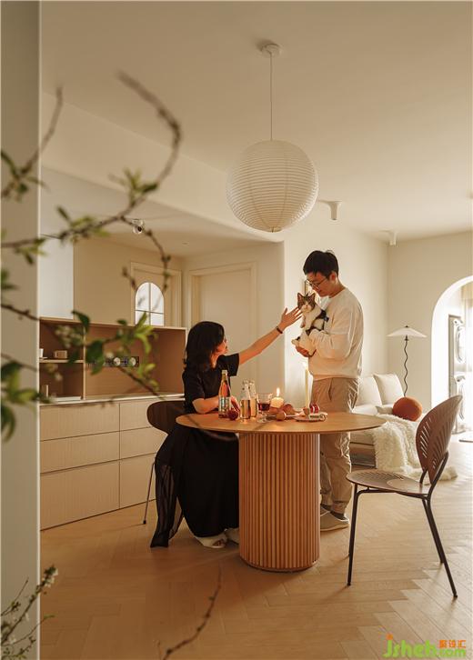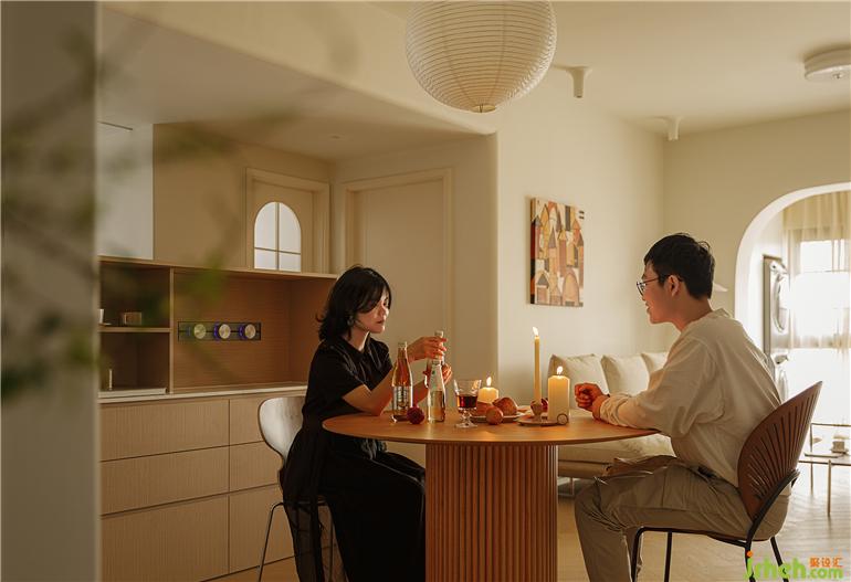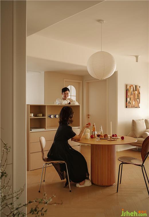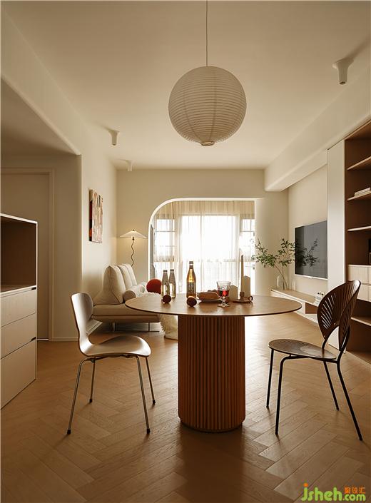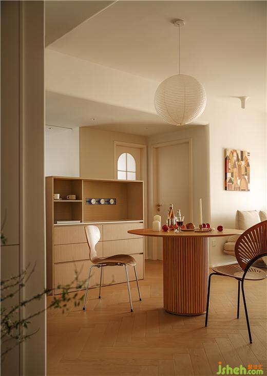 餐厅:原厨房门移位空间留给餐厅,星海名城家居设计拆掉与次卧之间的墙变成开放式,增设餐边柜台,更具使用性,也让空间感得到延伸