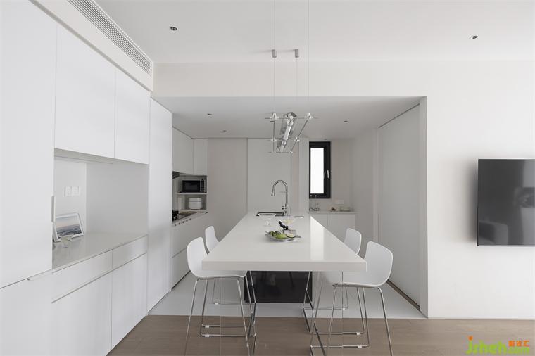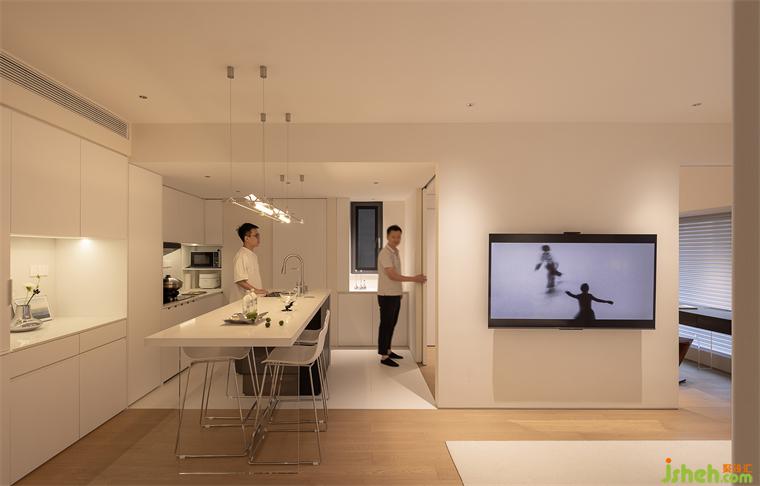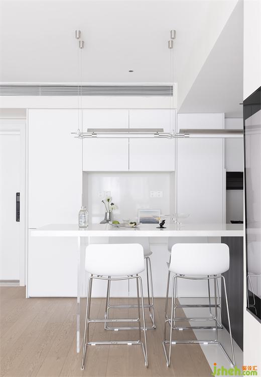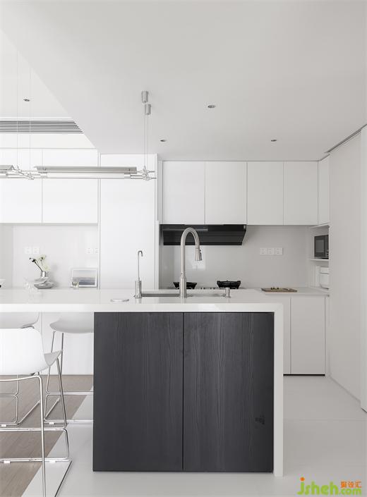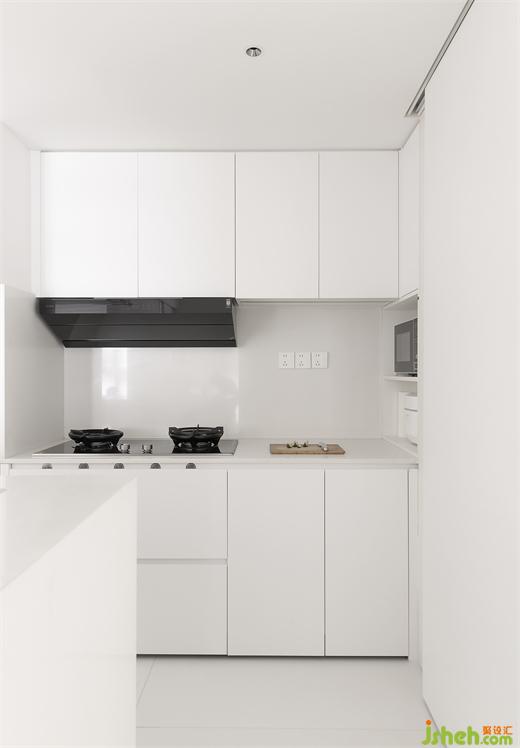 家装设计通体纯白的厨房,赏心悦目,无防水无下挂的处理,尽显干练清爽。操作台面与背景墙沿用耐脏的白色岩板,彰显细节的质感。感应灯带的设计,帮助屋主远离备菜背光的困扰,转角吊的下方中空区,见缝插针设计储物格,归置微波炉、电饭锅,将厨房的收纳空间进一步细分。#厨房#橱柜#收纳