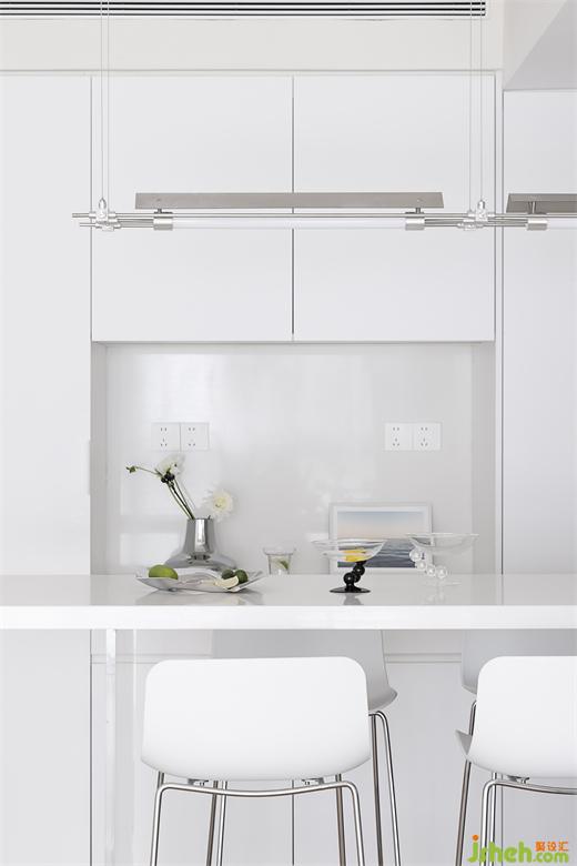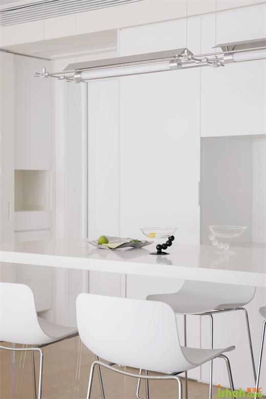 岛台延展出餐桌,餐厅空间利用更加细致,透明亚克力腿,赋予餐桌悬浮的既视感,一展轻盈灵动。四把金属高脚椅是优雅与实用结合的最佳阐释。#餐岛一体#岛台#高脚椅