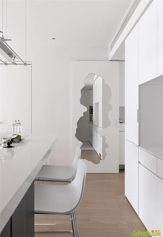 从餐厨看向玄关,视线恰好落足于衣帽间门的穿衣镜上,借由镜面反射,空间纵深感得以加强。#餐厨#玄关#镜子