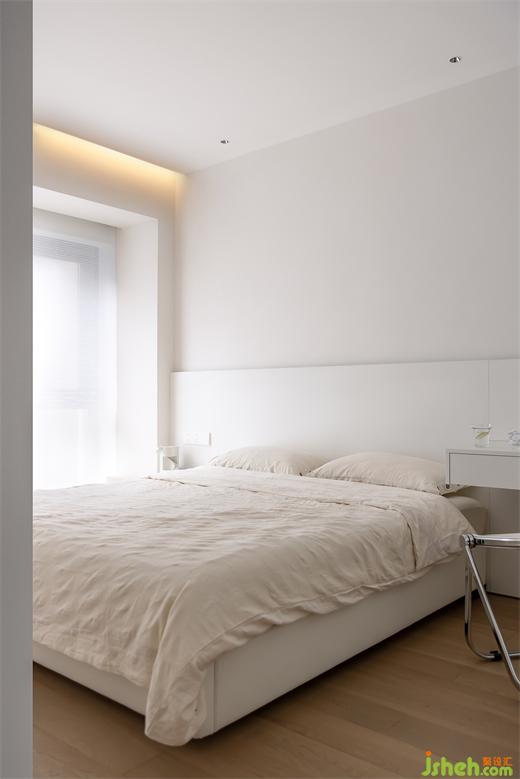 主卧启用悬浮吊顶,内嵌隐形灯带,床头做筒灯,更好地烘托入眠氛围,给疲惫一个释放的空间。白色饰面背板铺贴至半墙高度,与卧室风格完美契合,营造出立体的床头层次感。