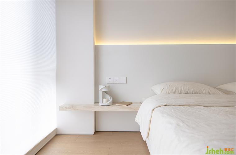 床头背板同样内置灯带,开灯后顿觉温馨感,悬挑的天然白洞石床头柜,家装设计将左侧墙垛与床头背板整合,支持随手置物,又减少了对床头采光的遮挡。#主卧#灯带#床头柜