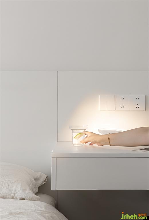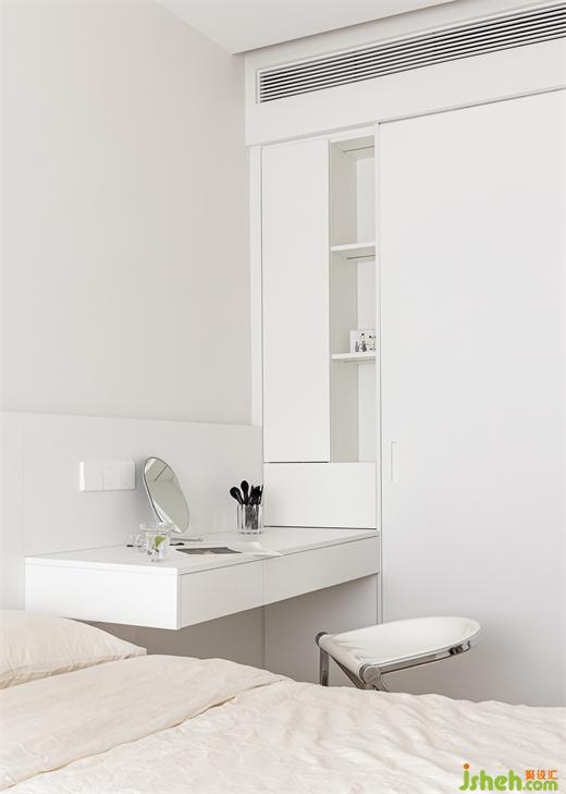 主卧贯彻极简设计语言,右侧床头填充与床头背板同材质的悬挂式梳妆台,并适配藏露结合的储物展示空间,描画妆容或是伏案阅读,皆从容自在。#床头柜#梳妆台#收纳