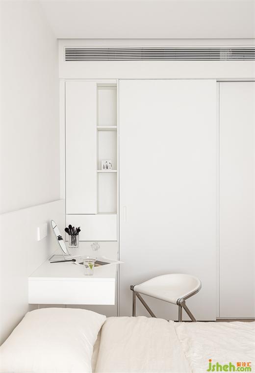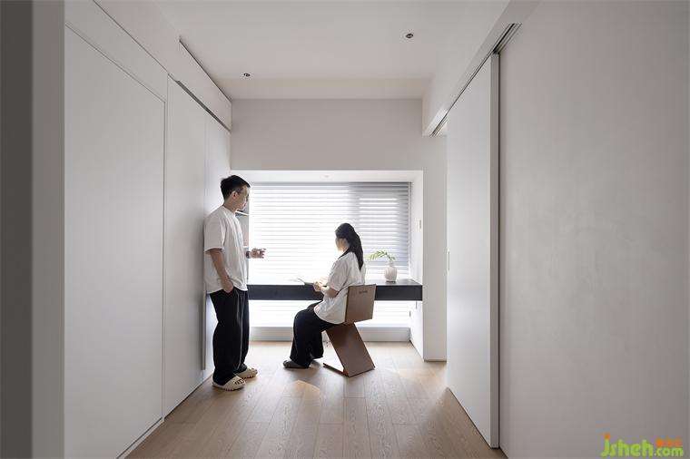 3、次卧两侧墙体拆改为开合自由的移门,动线自由,空间感得到最大限度延伸,移除室内飘窗改为书桌,靠墙高柜嵌入墨菲床,满足临时留宿,次卧功能复合,利用率最大化。