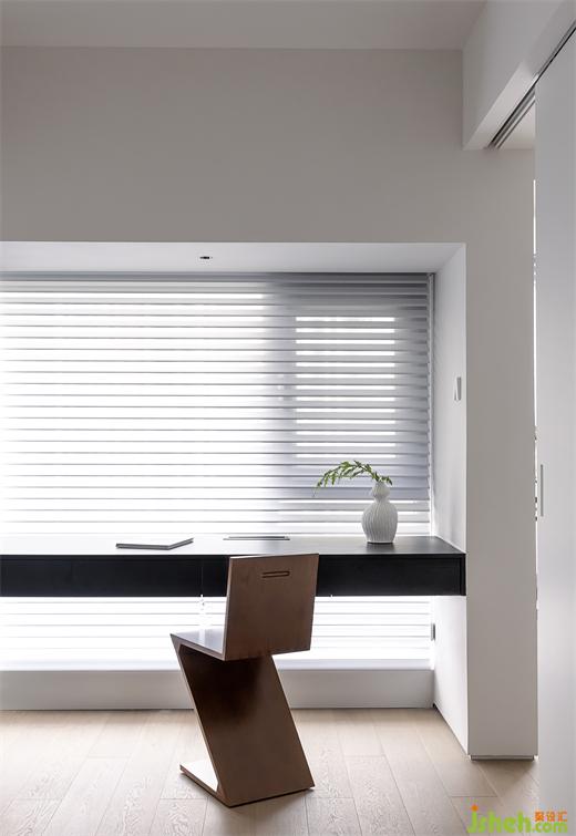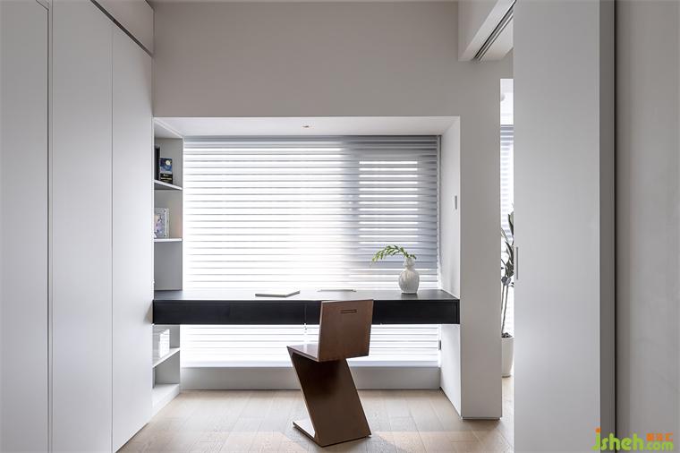 屋主的父母偶来短住,靠墙高柜嵌入墨菲床,放下即可充当临时客房。房内飘窗移除,改为抽屉书桌,并配以对应开放格书架和Z型椅,构建舒适工作区。#书房#墨菲床#书桌