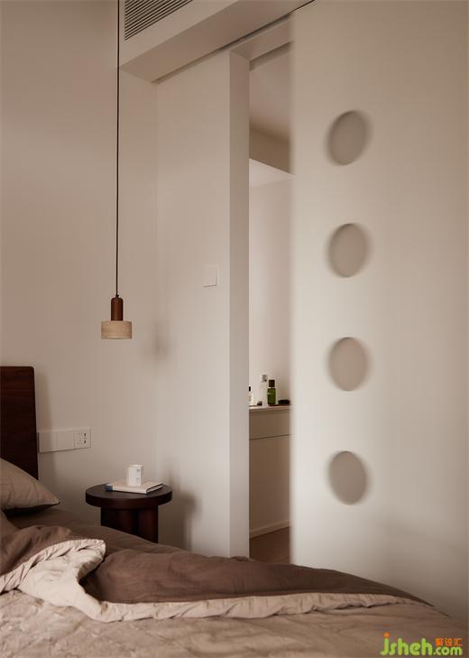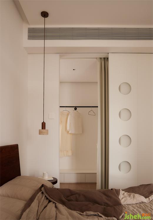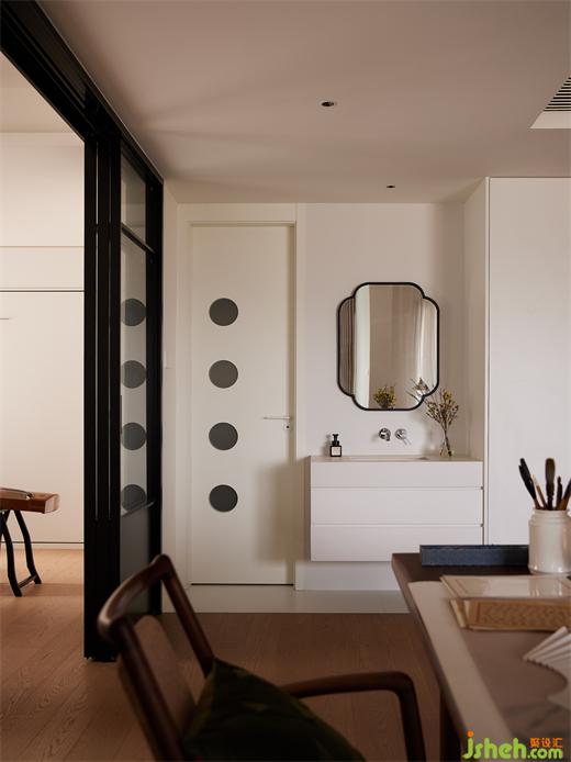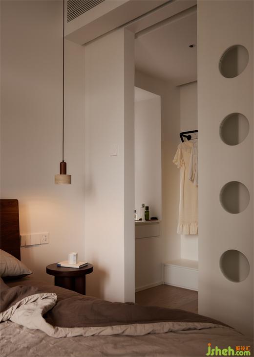 主卧:主卧房门一门两用,卫生间改为挂衣区与梳妆台,房门打开后,俨然变成了一个大套间,餐厨区客厅,主卧,次卧,流动性动线