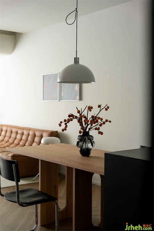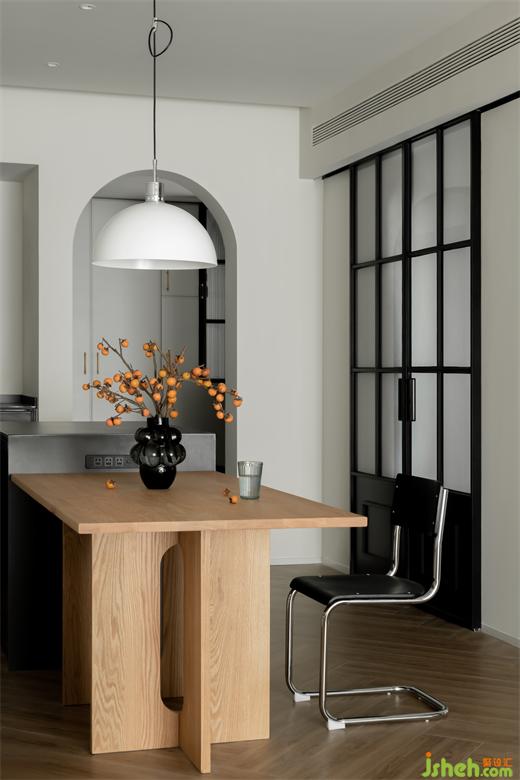 木色与黑白的搭配试图寻找一个支点来达到舒缓的美学平衡,长沙装修公司相悖的圆润与直线只为消除空间界限感,营造舒适的用餐环境。