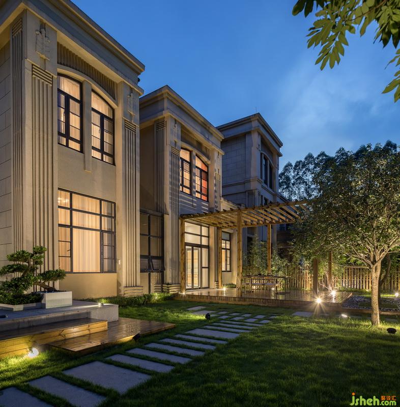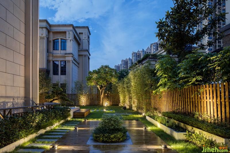 本项目拥有很大的前后花园,可以实现景观与建筑相互融合。花园的入口以青石板与鹅卵石搭配满铺作为前奏,水泥花基上高低有层次的绿植与防腐木围栏的竹子相互搭配,餐厅通往花园的区域做了一个抬高的防腐木地台,让整个空间层次感更强。幕色降临,灯光的明暗搭配,虚实的结合,丰富了景观的层次,在花园中体现得淋漓尽致。