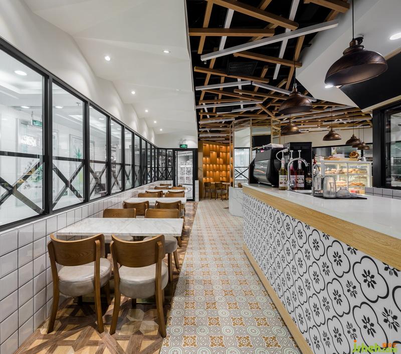 铺贴花砖的操作台褪去了单调感,同时增添了空间的趣味性。空间顶部用大量参差不齐的木条框装饰着整个空间,为空间增加了节奏感和层次感。白色瓷砖贴满墙壁与休闲桌进行和谐的统一,工业风格的灯具为空间增加了个性的味道。休闲区中的天花设计造型赋予菱形几何感,更突显了店铺的现代风,休闲桌脚架采用拉丝香槟金装饰增加高级感,配以皮垫原木色椅子,除了增加舒适度,还能加入休闲复古的气息。
