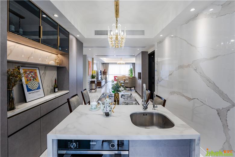 在效果图阶段,本来客厅就是灰调子作为基调,毕竟沙发调子已经定死了,所以Johnny哥就顺势将客厅以灰调用作客厅基调,大理石地砖为底调,纹理间的碰撞,完美衔接,落地玻璃外的美景尽收眼底。