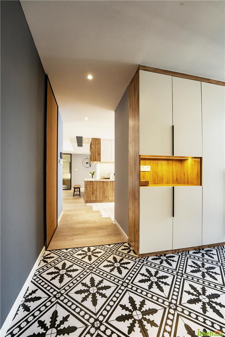 在玄关处的设计中,Johnny哥从墙面结构入手,延伸厨房墙体,如此,就得到一个开放式玄关储物区啦~简洁到顶的壁龛储物柜配以花砖的铺设,让这个储物间更为有趣!壁龛处平时放放钥匙也是方便得很。