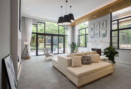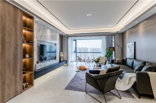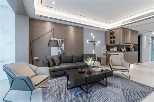背景墙这幅挂画简直就是神来之笔,一直关注有我们的小伙伴应该知道,这就是Johnny哥会客茶室的背景画!这只斑马活跃了这个客厅,简直不要太百搭!在软装上的选择,我们的软装部周周也动了不少小心思哦,像弧形地毯以及三角茶几,花纹窗纱和木纹电视柜,这些软装搭配都能让空间更出彩!