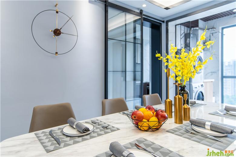 打通的阳台可以用作餐厅区域使用,在这有限的空间内被表达的淋漓尽致。强化空间的长处,弱化甚至隐藏短处。