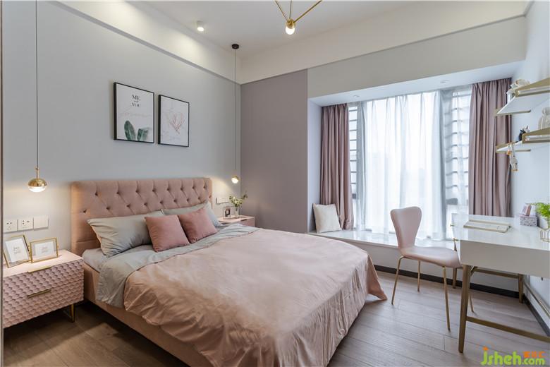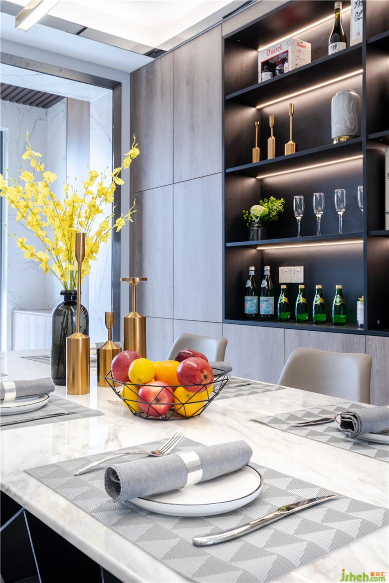 浅灰和静谧天空蓝的色彩搭配,温暖整个空间。背景墙用的台湾进口科定板,与客厅互相呼应却又各自精彩。整洁的收纳柜将简约美,与现代生活需求融为一体。