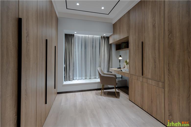 衣帽间与书房自然融合,两者都是不经常用到的区域,将两者结合既能用作休闲区域有能做为实用区域。其家具物件选以皮质与木材搭配纯静简洁的空间,诠释出空间力求自然极简的调性。