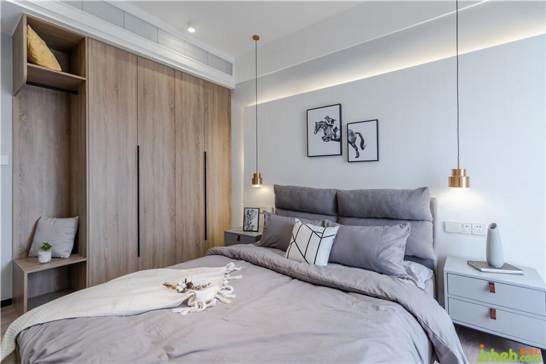 金属元素与冷静的色彩碰撞出奢华感。挂画在床头上温润而有力地展现着独自的活力,到顶衣柜依旧与客餐厅的板材基材相衬托。