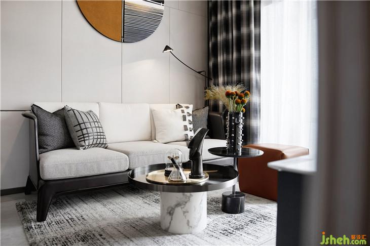 无论是灵动光圈的灯饰,抑或充满层次感的茶几,窗帘上的格纹,甚至是花瓶上的铆钉,都是卸下中规中矩这个枷锁的利器。赤茶色挂画、挂饰与坐凳的加入缓和了强烈的个性,注入温润的气息。
