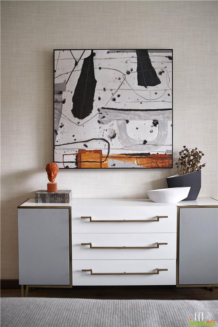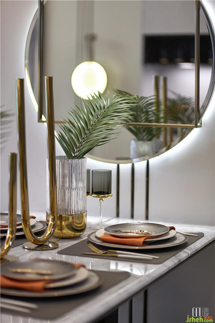 在餐厅这样一个开放的空间里,设计师采用“对称式”陈设手法,和谐地容纳性格迥异的材质——皮革、大理石、金属等。以灯饰、镜框及餐具的相对对称,呈现出平衡、庄重之美。
