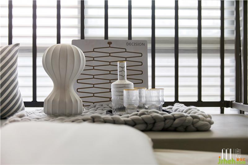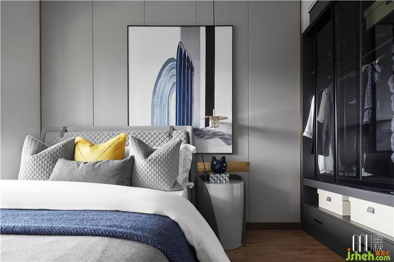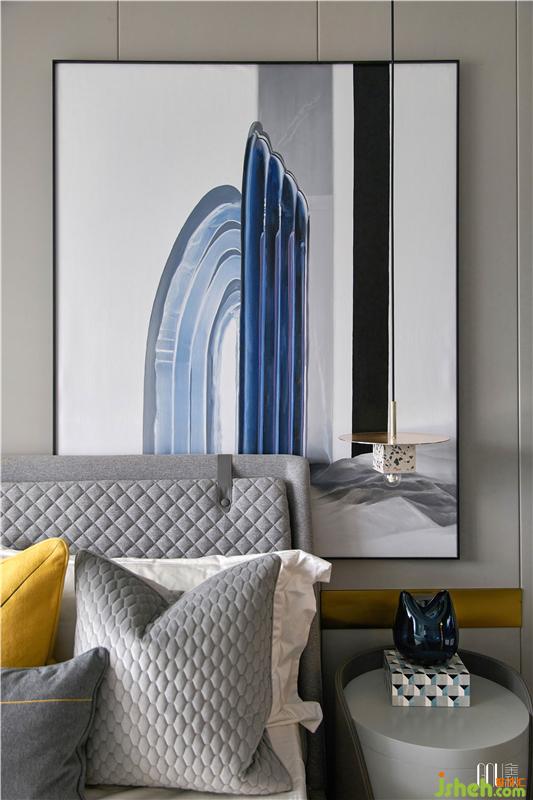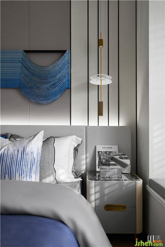 主卧以清爽淡雅的色调展现出不疾不徐的姿态,如流水般柔而能克刚,静而能映物,辅以织物的不同质地、以细节呼应的吊灯和摆饰,一个时尚独立又恬静优雅的女主人形象呼之欲出。