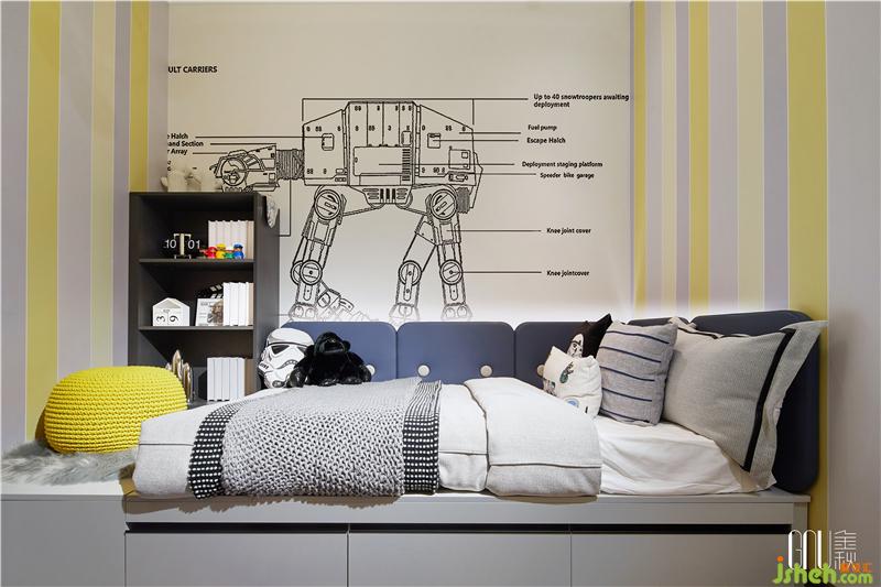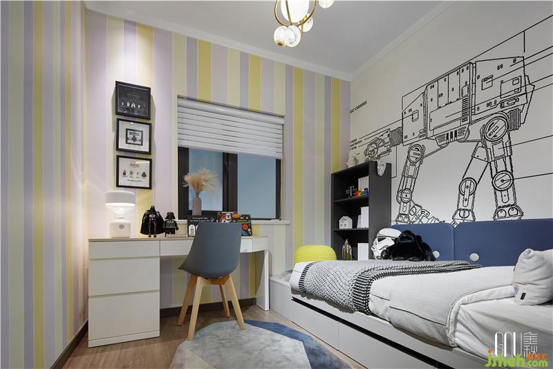 客卧与男孩房在整体色调基础上,根据房间的不同功能调节了颜色配比,在黄色这类膨胀色的运用上,客卧调减了比例,男孩房则相对调增,呈现出稳重与活力两种倾向。让形式服从功能,附加装饰点到为止,是北欧简约风的最佳注释。