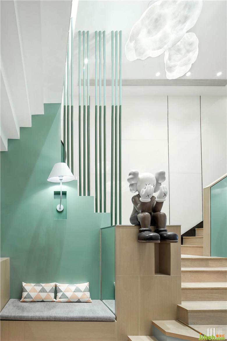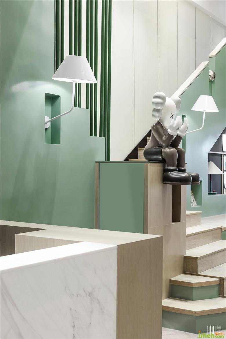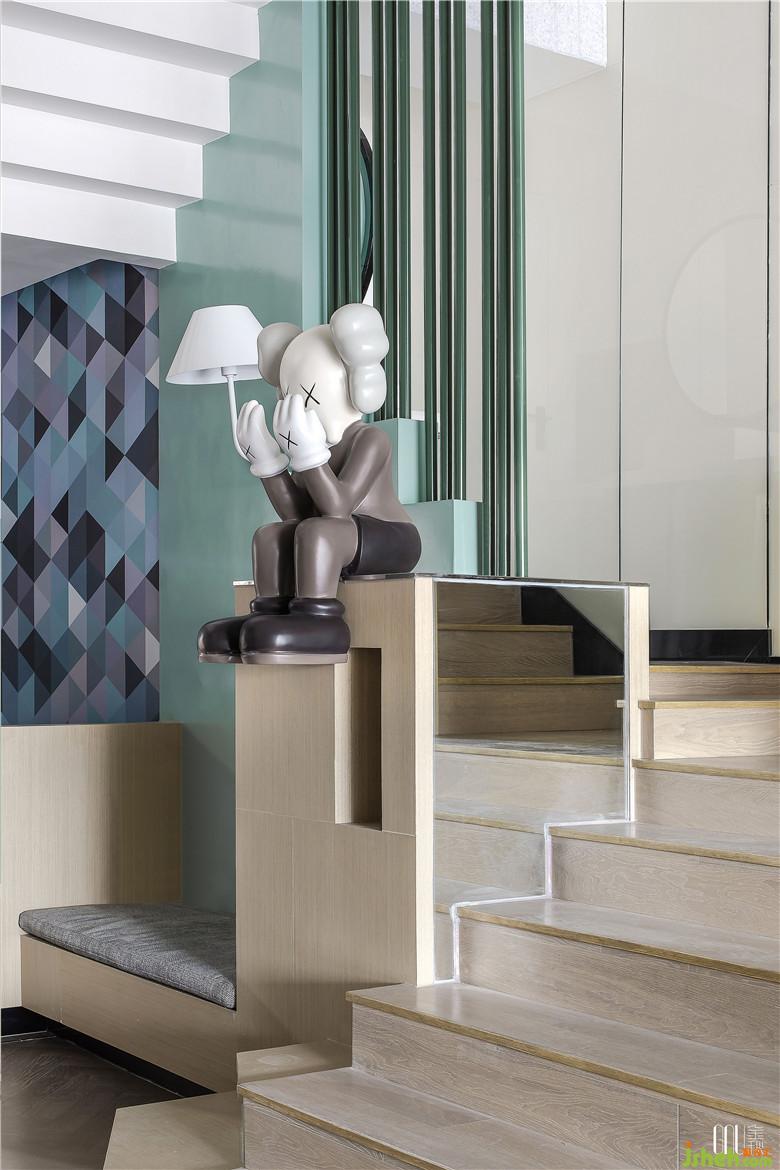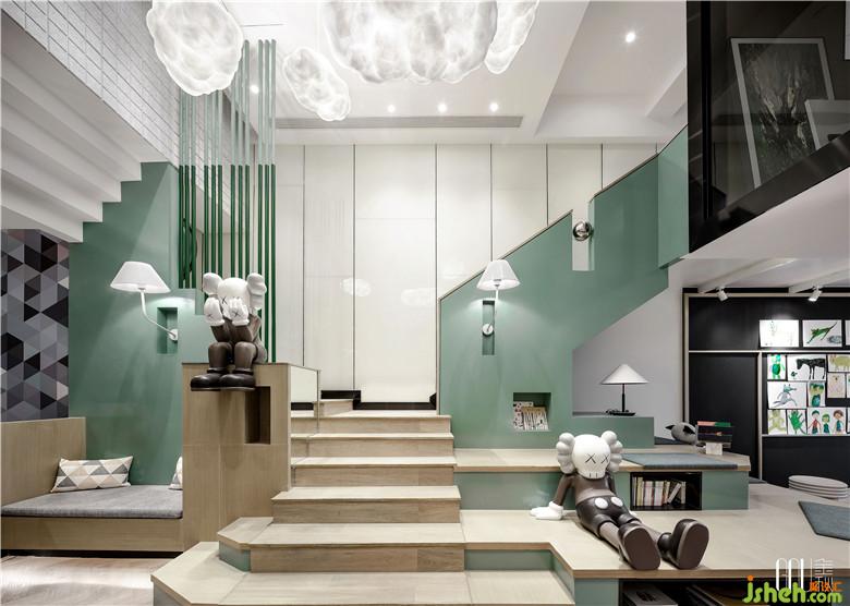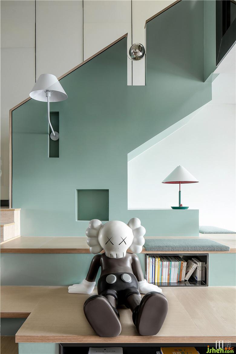 创作的阶梯为灵动的人偶和暗藏在阶梯处的书柜所构筑,阶梯处别致的凹凸设计为立体创作点亮灵感。