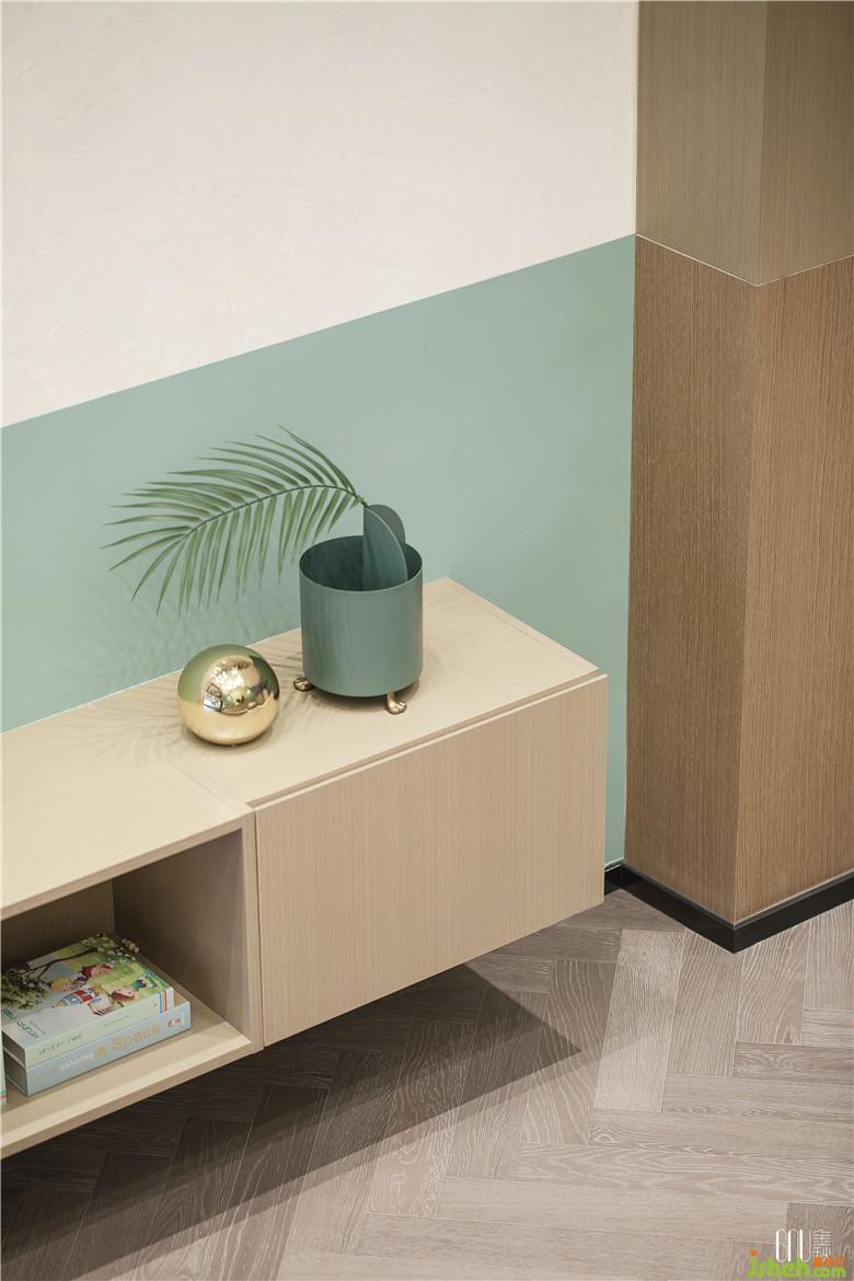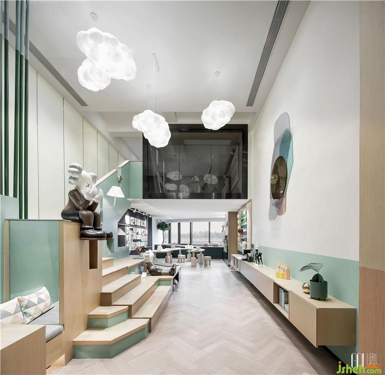 设计师在寒冬留下的画布上绘出春色。以绿色为主调的开放式空间里,错拼木地板镶嵌交互区和手工制作区的缝隙,垂下的白云布景连接二楼的色彩教室,体现空间设计的主题。