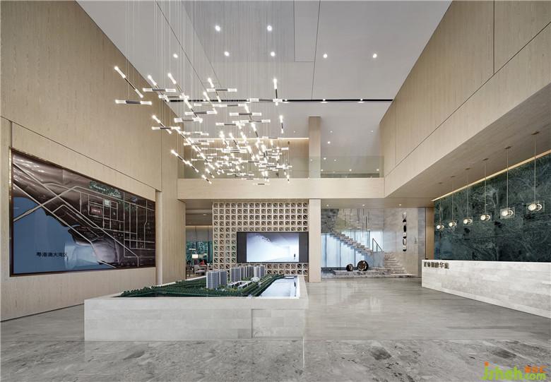 眼前的沙盘区极简通透,没有多余的装饰,以灯饰的流线感将整个空间连贯起来。沙盘上方的吊灯,远看错落,近看规整,寓意从不同的角度看,对事物的感知也不同。