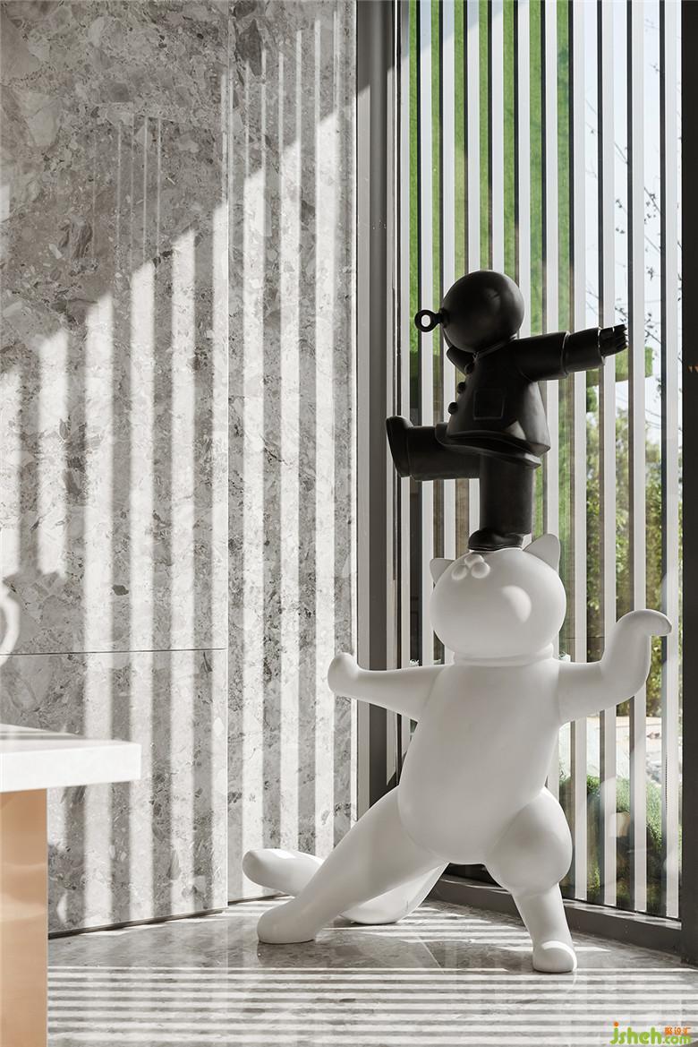 在落地窗的一角,出其不意的放置了一座Q版雕塑,为这个板正的空间增添了趣味性和活力。
