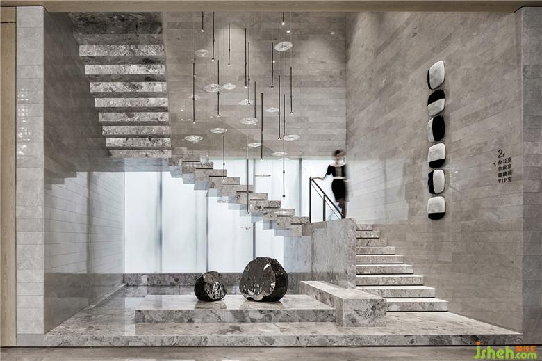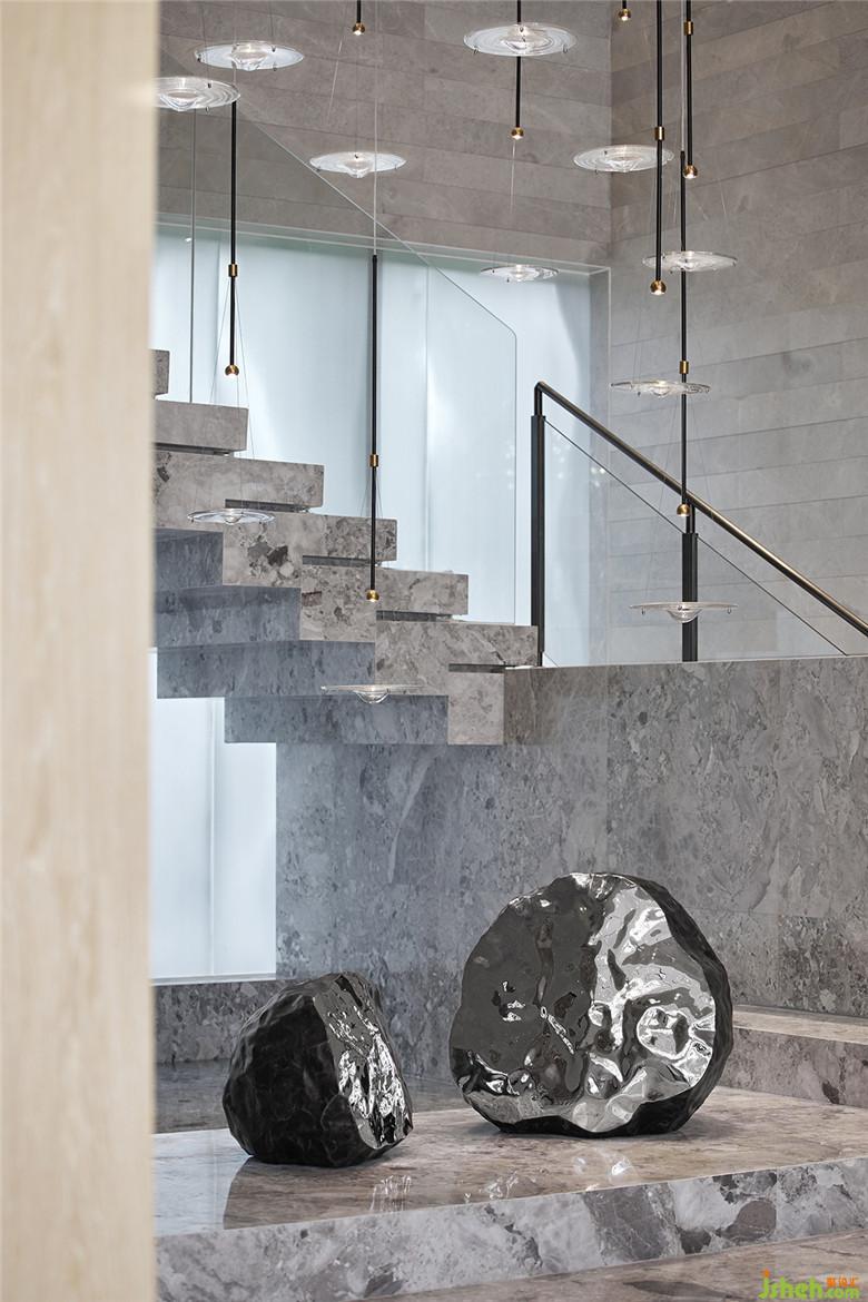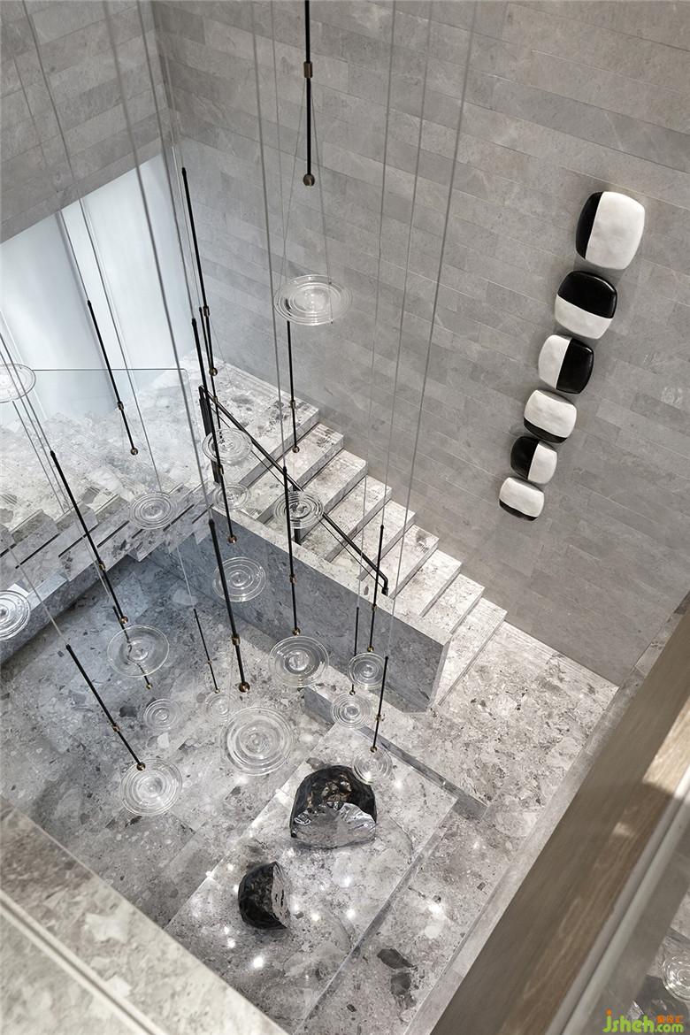 在楼梯水景区,与自然融合的意境被巧妙地藏在了这里。吊灯的灵感来源于雨滴落下激起的涟漪,从水平方向上看不出端倪,但从高处往下看,仿佛真有涟漪在空气中晕开,化成了清灵之感。