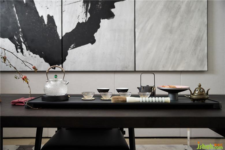 二楼的茶室以水墨渲染空间,中式元素的摆件和别致的茶具透出浅浅禅意,其义自见。