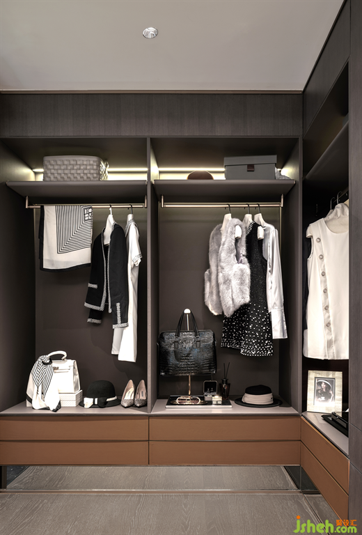 样板房设计极致地利用空间,将270度的转角飘窗打造成开放式衣柜,以更契合居者的品味格调,刻画艺术情致。