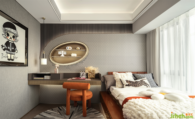 儿童房利用飘窗打造成榻榻米,释放更多的空间,样板房设计营构更加舒适的使用感。玩趣的造型,多元的肌理,构成天真浪漫的生动叙事。