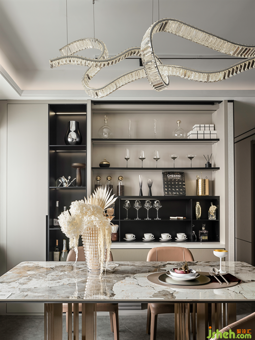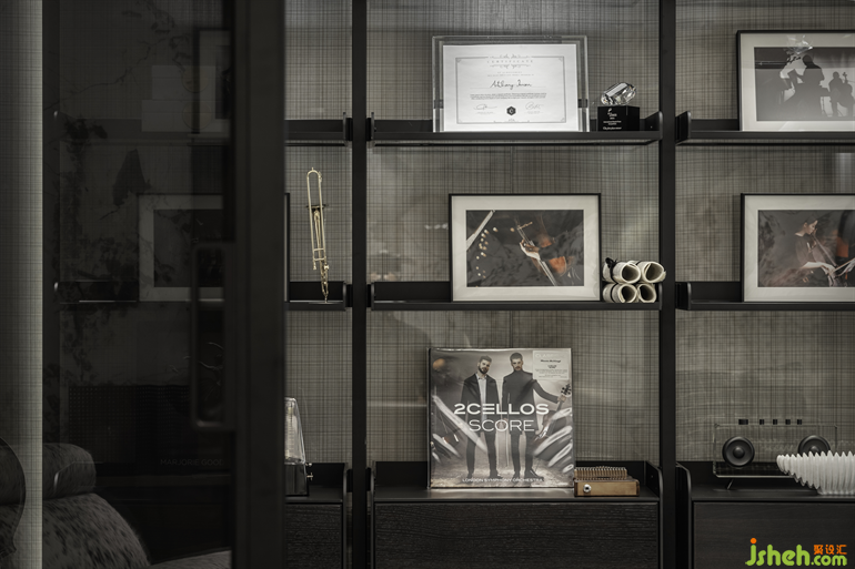 客厅是整个居所价值感营构的关键,GNU基于对目标客群的生活场景分析,样板房设计了两稿方案:方案一为纯4居室,满足三代同堂、两孩的大家族功能需求,同时通过玻璃、金属等透明轻便材质,创造宽阔的视野景观;方案二为3+1户型,将客厅与音乐房仅用沙发予以半隔断,消弭空间边界,延长横厅的视线观感,放大了客厅的尺度。