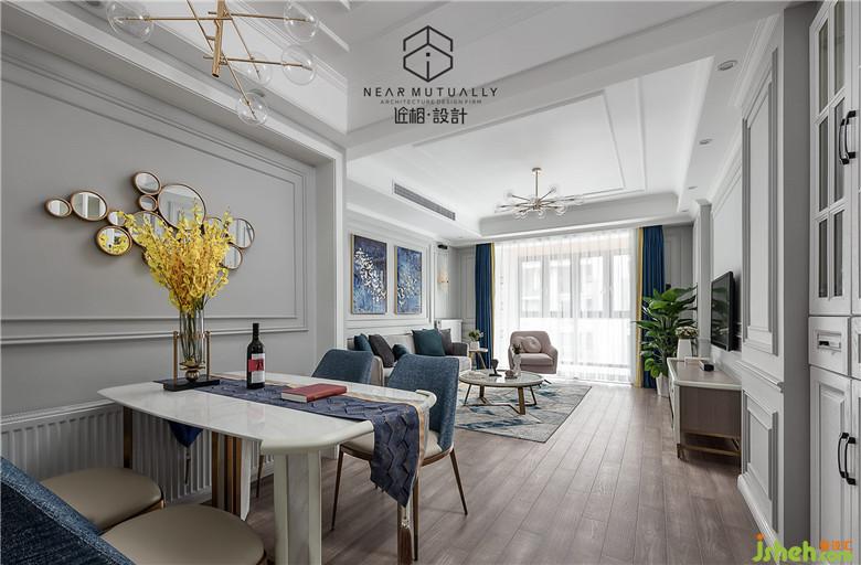 公共区域的挑色选择的是蓝色和黄色,因为室内设计师和业主都很喜欢蓝色,所以再装饰画,软配的选择上不默而合,很快的就确定下来。