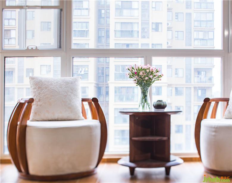 主卧在与改造后的书房之间做了整面衣柜,压缩了书房空间,使主卧空间尽量宽松。5客厅阳台现在改造成休闲阳台,增加客厅活动空间,在养了植物花卉后,坐在客厅观赏下花草。