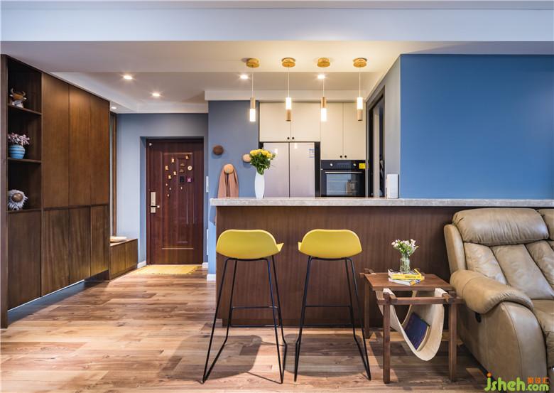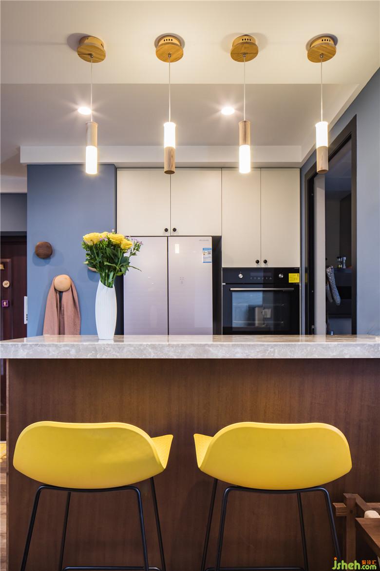 厨房阳台取消,作为中厨一部分,并把厨房分为2部分,外面设置了吧台,烤箱蒸箱位置,里面又个独立的中厨。入户靠右边的厨房墙面拿掉后,整个进门视野变得也开阔了,同时增加了采光。整个厨房与厅里的互动性也曾强。
