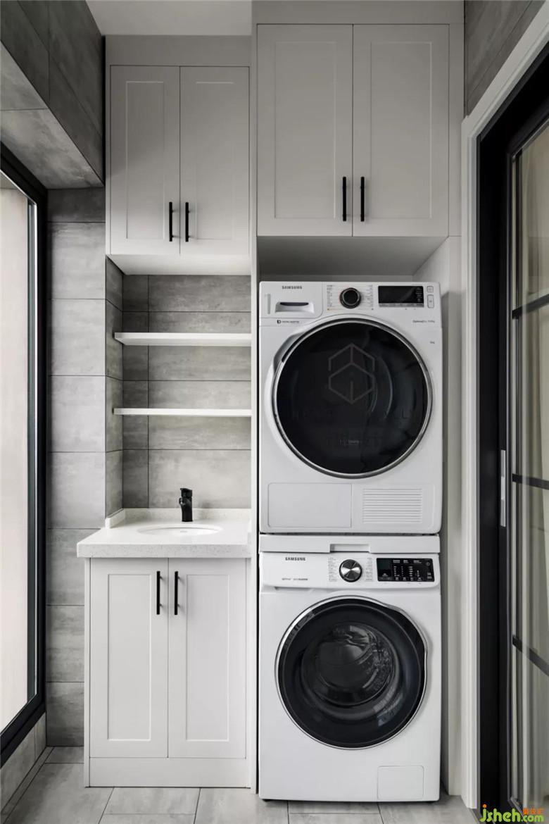 阳台空间往外推,次卧和阳台区域留出阳台储物柜得区域,洗衣机烘干机为上下重叠得方式。