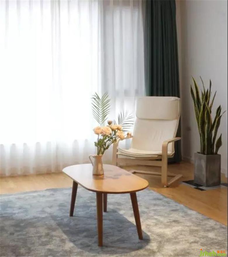 角落里的白色椅子惬意地靠着窗边,午后温暖的阳光透过玻璃窗散落在地毯上,在静谧的空间中上演光与影的奏鸣曲,看起来仿若一幅安静躺在美术馆的现代名画,温馨美好。