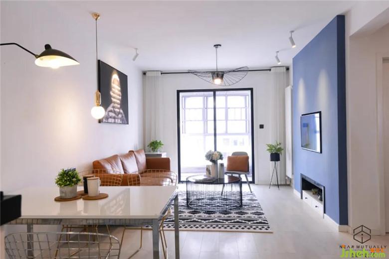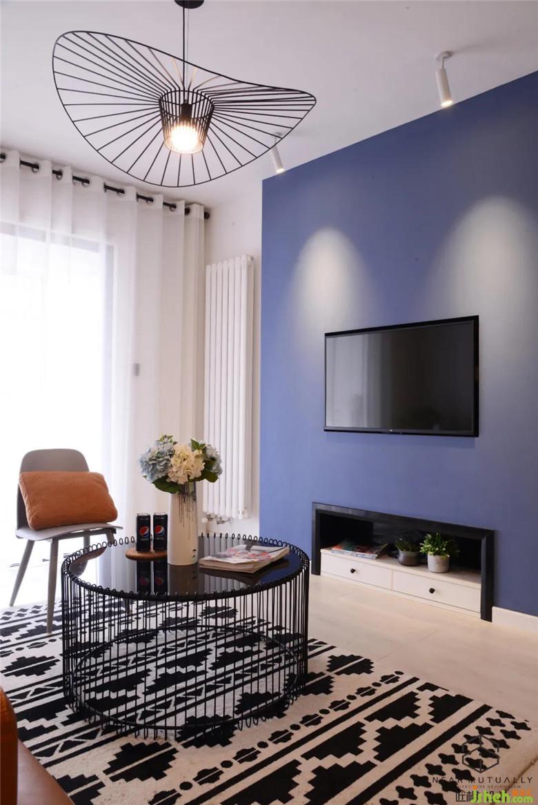 在设计中,客厅与餐厅连在一体,装修公司通过顶部或墙面部分来区别空间,使整体显得更加宽敞。大胆的电视背景墙跳色也是对设计师能力的一种考验。