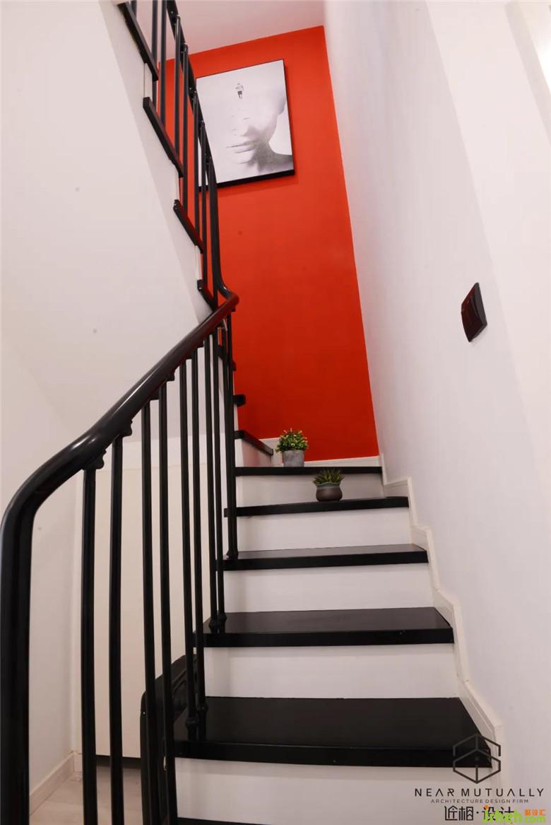 楼梯间用大红色做出跳色,装修公司让简单的空间有更多的视觉可能,与楼下背景墙产生对比,跳出了传统极简的冷色调。