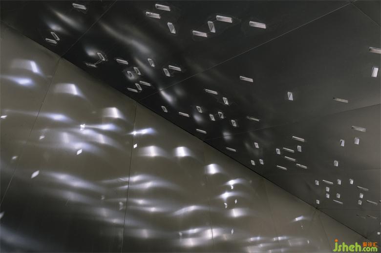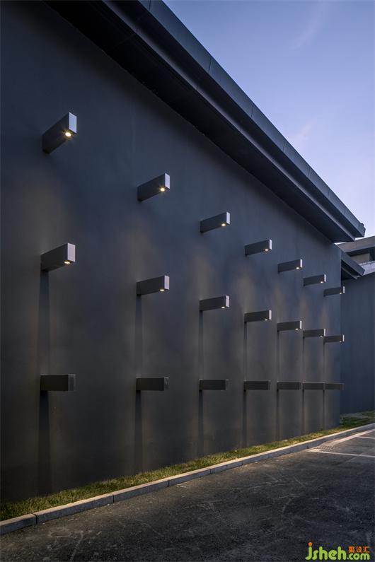 The SouthFaçade iscovered with a matrix of 54 steel light boxes. These protruded rectilinear structures cast an array of shadows onto the grey stucco wall. The angle and the lengths of the shadows constantly change throughout the day according to the solar position. Downlights are also embedded into the box to light up the façade creating another kind of pattern during the nighttime. These structures can also be used to hang large posters or displays that may be required by the museum for different events.