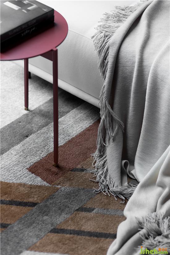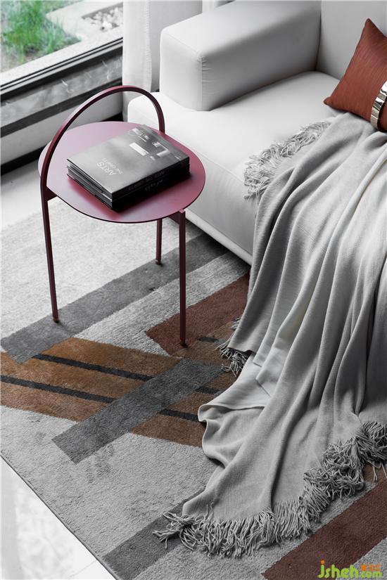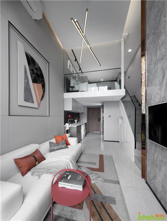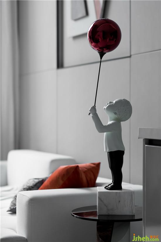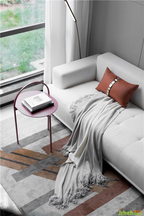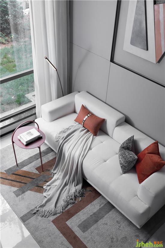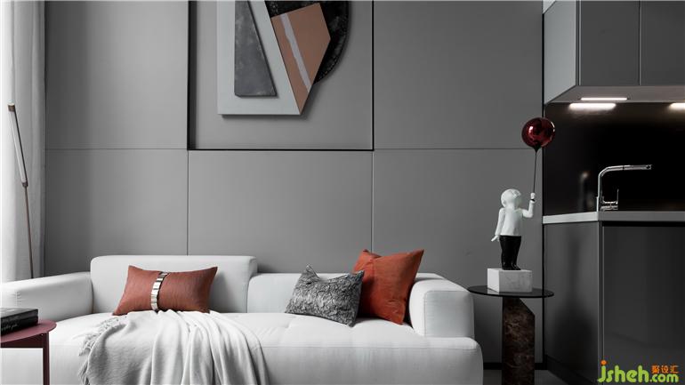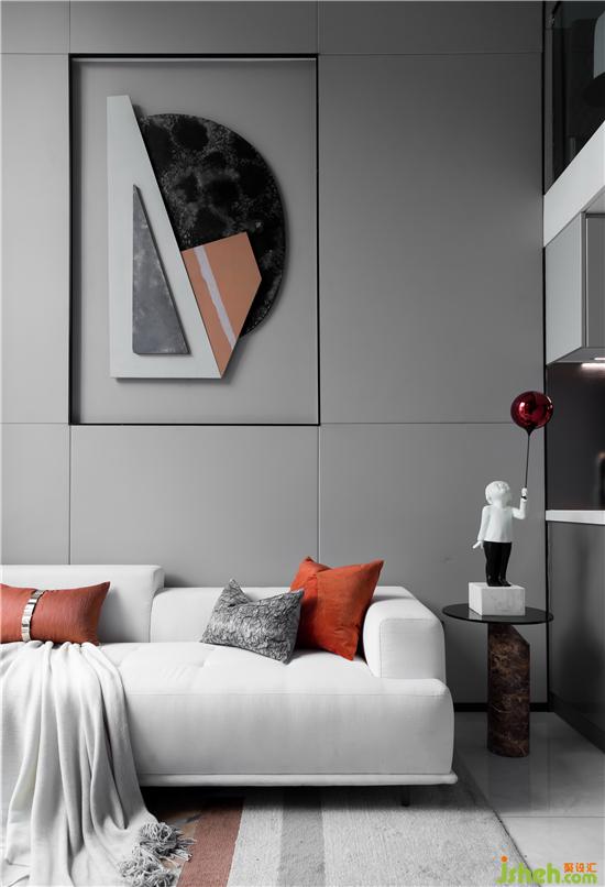 在低饱和度灰调的铺叙下,采取不同层次的橘色作为点缀,勾勒着简约灵动的空间氛围。墙面的抽象拼贴挂画与几何构图的地毯形成对映,长沙样板房设计搭配极具艺术格调的装饰小品、材质柔软的布艺沙发、不规则大理石凳几,空间呈现出和谐统一的当代美学秩序。