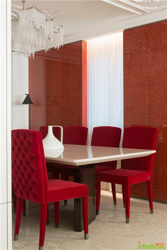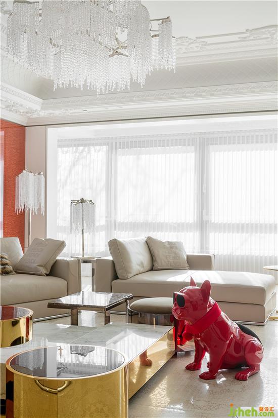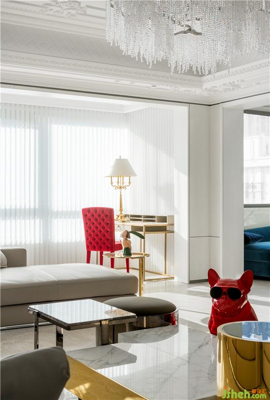 家,是与家庭成员生活在其中的舒适场域,而白色是现代都市风格的灵魂,更是映衬客厅宽阔尺度与自然光线的绝佳色调。私宅设计在白色调的基础上雕花,描摹细节的艺术,同时以小范围点缀的形式,将浓烈而华丽的红调注入空间之中,打破了纯粹当代的刻板气息。丝绒单椅、皮质沙发、漆面小狗摆件、水晶流苏灯饰、描金艺术装置画......空间中的一切组合相互融合,注入一抹活泼灵动的气韵,让居者同时品味生活的艺术感与烟火气。