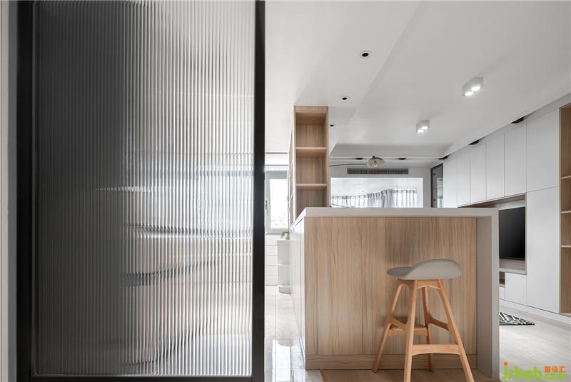 原本房子是没有玄关的,离电梯门很近,如果开门没有遮挡,显然不尽人意。要是强制增加隔断,又容易破坏宽敞空间的大好采光。所以在入门玄关的位置,北京室内设计师加入了单扇的长虹玻璃。既能满足单向采光进入玄关,透光不投影的隔断也具备遮挡性。营造光影的效果从开门起,就成为左邻右舍羡慕嫉妒的房子,是空间最恰当的语言。