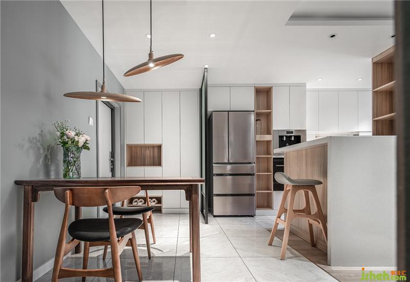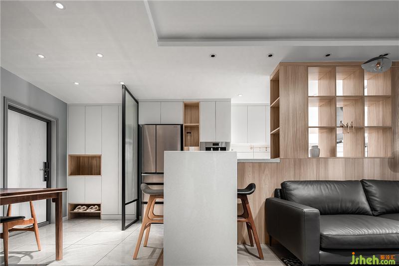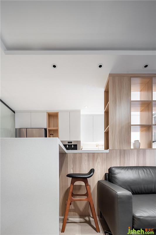 干净的白色石材与柜板做了内嵌,单纯得简单。作为厨房和客厅,客厅与餐厅之间的过度功能,吧台显然有着不错的独特作用。沙发和吧台之间有一段800mm的距离,方便对坐吧椅摆放。