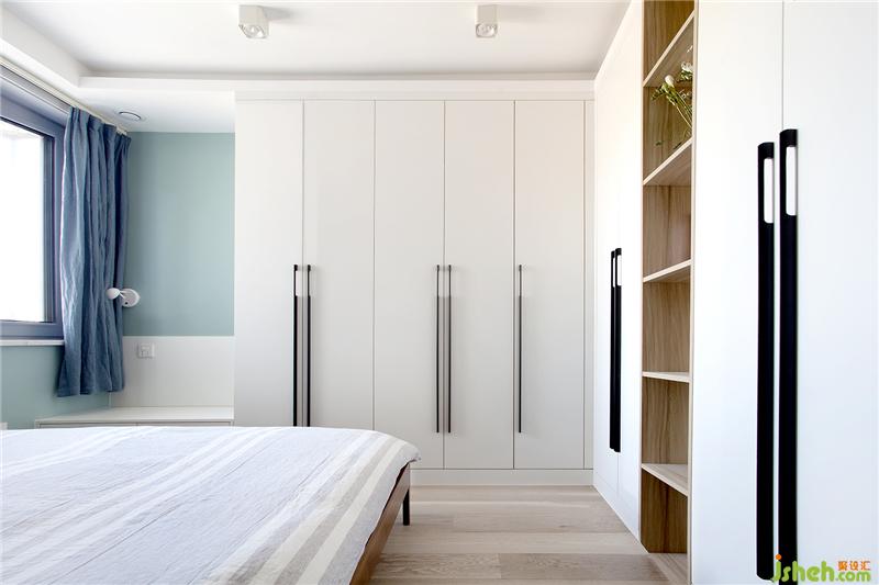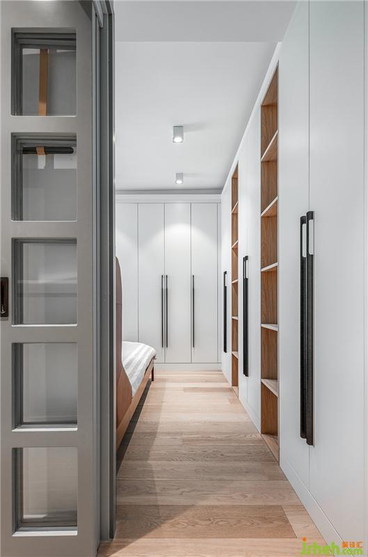 卧室门前1800mm的小过道旁边,有一道透光的玻璃折叠门,保证了空间通透性,里面其实就是床头背后的衣帽间。