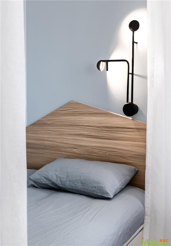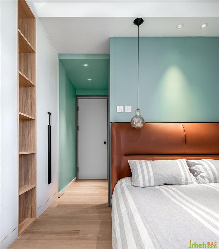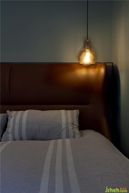 弱饱和的绿色调,搭配皮质深栗色床头软包,一种清新明快,一种沉寂安逸。留给床头的面积微乎其微,只有从顶上悬吊下来的小吊灯,是Rebea睡前夜读时最大的满足。